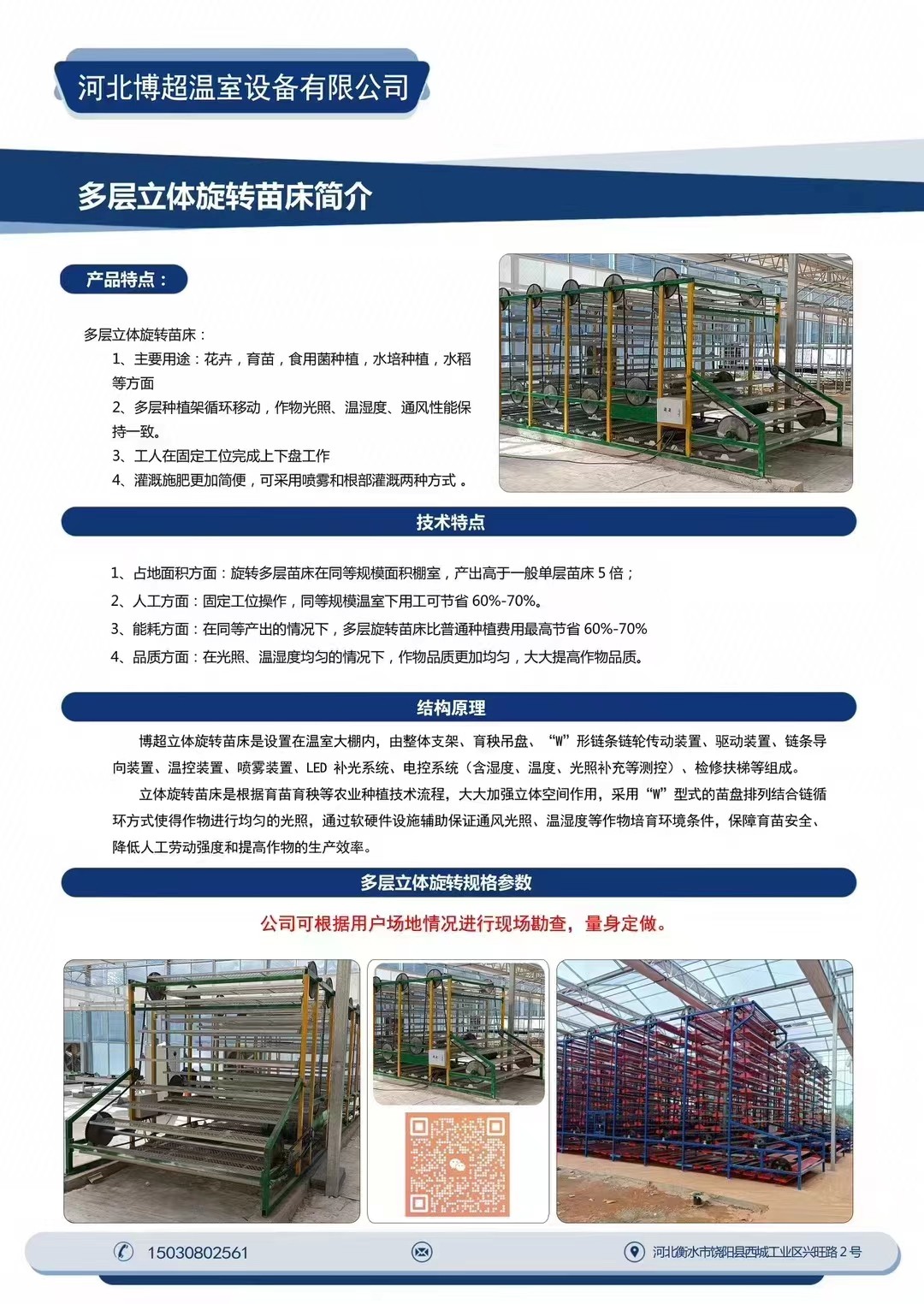 W型立體旋轉育秧床產品特點:1:主要用途:水稻育秧、牧草種植、食用菌種植、花卉育苗等;2:多層種植循環移動,作物光照、溫度濕度保持一致: